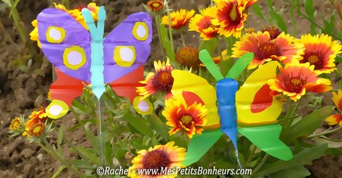 Envie de mettre des couleurs dans le jardin? Le blg « Mes petits bonheurs » propose de réaliser de jolis papillons avec de vieilles bouteilles d’eau en plastique. Avec l’aide d’un « grand » pour la découpe, c’est parti pour les couleurs!